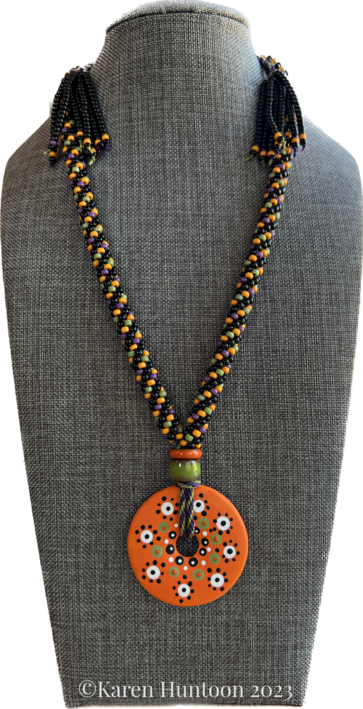 The Kumihimo beaded necklace with a handpainted ceramic mandala pendant is a beauty.